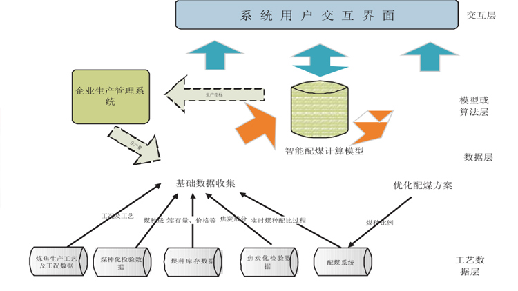 當(dāng)前,國內(nèi)焦化廠普遍采用專家配煤的模式,配煤專家基于自身經(jīng)驗結(jié)合焦化廠生產(chǎn)需求給出配煤方案,以此指導(dǎo)煉焦配煤生產(chǎn)過程。這種模式具有穩(wěn)定、可靠的優(yōu)勢,但也存在專家勞動強(qiáng)度大、配煤風(fēng)險高、配煤成本較高等不足。智能配煤系統(tǒng)采用目前先進(jìn)的工業(yè)大數(shù)據(jù)平臺和數(shù)據(jù)分析技術(shù),根據(jù)現(xiàn)場煤種的成分、庫存、成本等數(shù)據(jù),結(jié)合業(yè)主對焦炭質(zhì)量的要求,通過數(shù)據(jù)分析、規(guī)則提取、神經(jīng)網(wǎng)絡(luò)計算等技術(shù)手段,給出符合企業(yè)生產(chǎn)需求的優(yōu)配煤方案。