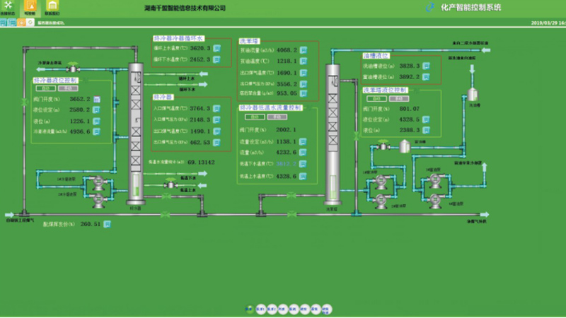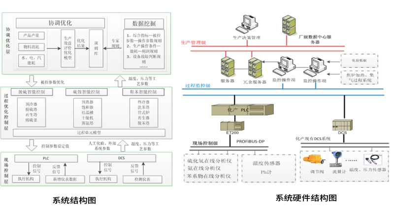 本系統(tǒng)從焦化一體化智能控制平臺出發(fā),主要包含脫硫子 系統(tǒng)、硫銨與蒸氨子系統(tǒng)、粗苯子系統(tǒng)及底層設(shè)備控制子系統(tǒng), 對關(guān)鍵參數(shù)進(jìn)行智能預(yù)測與控制,對底層設(shè)備進(jìn)行聯(lián)鎖操作與 狀態(tài)診斷,通過協(xié)調(diào)優(yōu)化,實(shí)現(xiàn)底層設(shè)備自動控制、過程環(huán)節(jié) 穩(wěn)定控制、上層管理協(xié)調(diào)優(yōu)化,達(dá)到優(yōu)化生產(chǎn)過程、降低成本、提高管理水平的目的。
