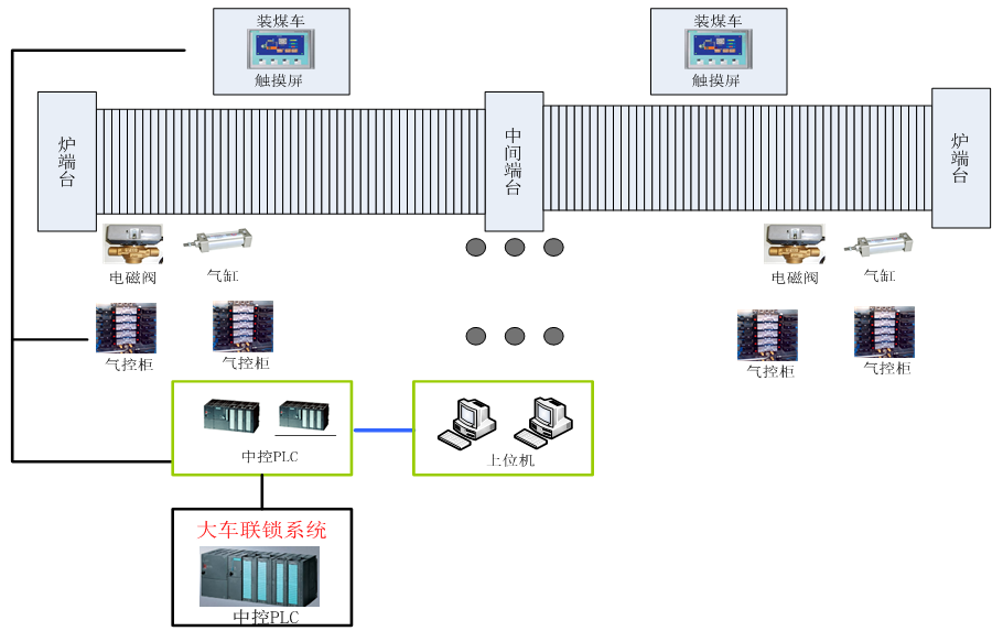 對上升管、內(nèi)翻板和高低壓氨水的相關(guān)動作和時間進(jìn)行記錄,并對某一動作時間和動作間間隔等進(jìn)行統(tǒng)計??筛鶕?jù)操作方式、操作內(nèi)容和時間等進(jìn)行查詢。整個包括現(xiàn)場機(jī)械部分、現(xiàn)場 氣控柜部分、中控室部分、車載部 分和系統(tǒng)網(wǎng)絡(luò)。其中,現(xiàn)場部分是 系統(tǒng)的基礎(chǔ)硬件部分,其他三部分 為控制部分。現(xiàn)場部分包含上升管蓋、內(nèi)翻板和高低壓氨水實現(xiàn)自動控制所包含的氣缸、電磁閥及相關(guān)連接件。其他電氣和控制部分主要包含氣動閥組、PLC模塊和上位機(jī)等,分別用于對現(xiàn)場設(shè)備狀態(tài)采集和控制指令輸出、系統(tǒng)的控制邏輯判斷和指令下發(fā)和數(shù)據(jù)存儲、展示以及人機(jī)交互操作。