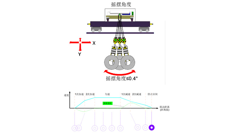 天車在變速運(yùn)動(dòng)中主鉤速度變化會(huì)滯后于大車和小車的速度變化,不可避免的會(huì)發(fā)生主鉤晃動(dòng)的情況,這給天車的安全運(yùn)行帶來了風(fēng)險(xiǎn),為了消除這種速度變化不同步帶來的角度搖擺,讓天車在最短的時(shí)間內(nèi)平穩(wěn)的達(dá)到目標(biāo)位置,天車系統(tǒng)的設(shè)計(jì)中需加入防搖擺控制技術(shù)。