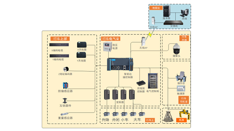 采用高清網(wǎng)絡(luò)攝像機(jī)實(shí)時(shí)監(jiān)控天車大小車及吊具,通過無線傳輸將天車視頻圖像傳輸至中控室,并針對(duì)整個(gè)庫房或料場(chǎng),規(guī)劃多個(gè)視頻監(jiān)控點(diǎn),方便中控室操作人員遠(yuǎn)程視頻確認(rèn)現(xiàn)場(chǎng)情況。過跨車無人操作